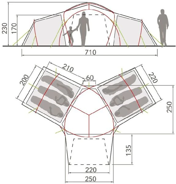 Door zijn grote formaat is deze tent minder geschikt voor trektochten en backpacken. De tent weegt namelijk 12 kg en zit verpakt in een zak van 70 bij 35 cm. Echter betekent dit niet dat de tent niet makkelijk in gebruik is. Dankzij de innovatieve koepelconstructie hoef je alleen de stokken in elkaar te klikken en vervolgens in de tent te schuiven. De binnententen zijn al bevestigd aan de buitentent, dus deze hoef je niet apart vast te maken. Alle tentstokken hebben dezelfde lengte behalve de 2 donkergrijze, waardoor geen verwarring optreed over welke stok waar hoort. De tent wordt geleverd in een zak die groter is dan het pakformaat van de tent zelf. Wanneer je hier de tent in hebt gedaan kun je de zak zo strak mogelijk oprollen en bevestigen. Hierdoor kun je de tent altijd gemakkelijk in de zak terugkrijgen.